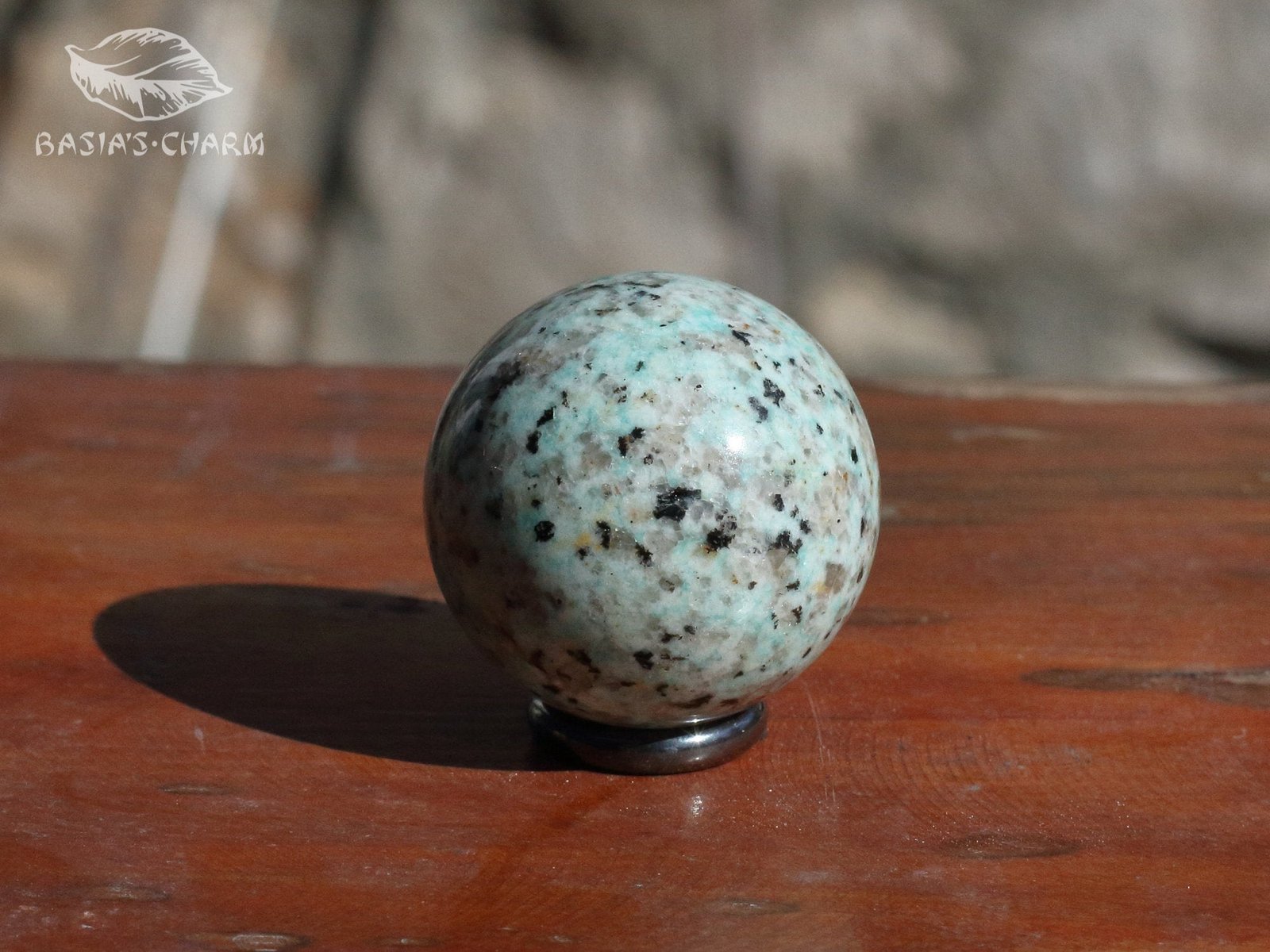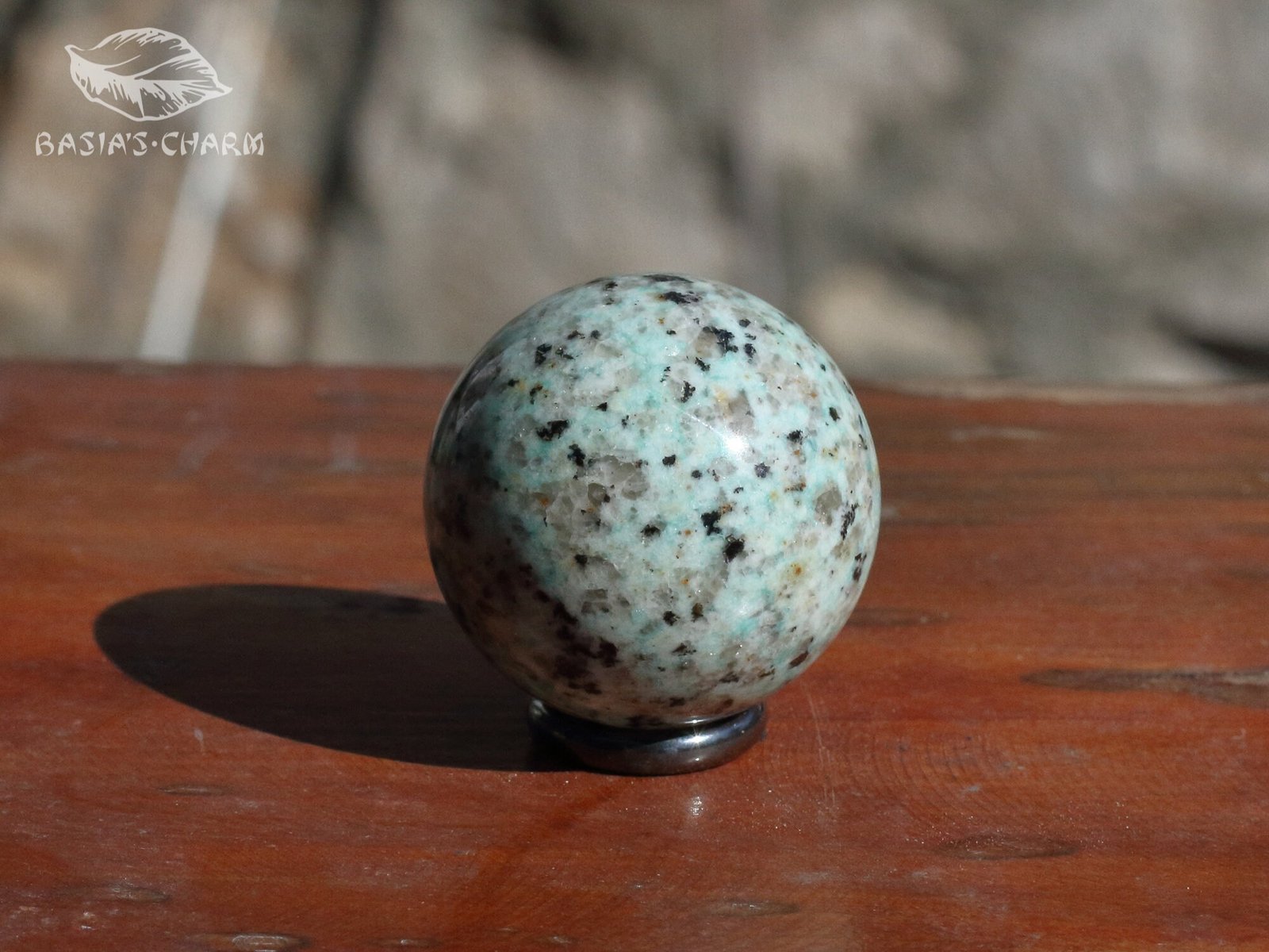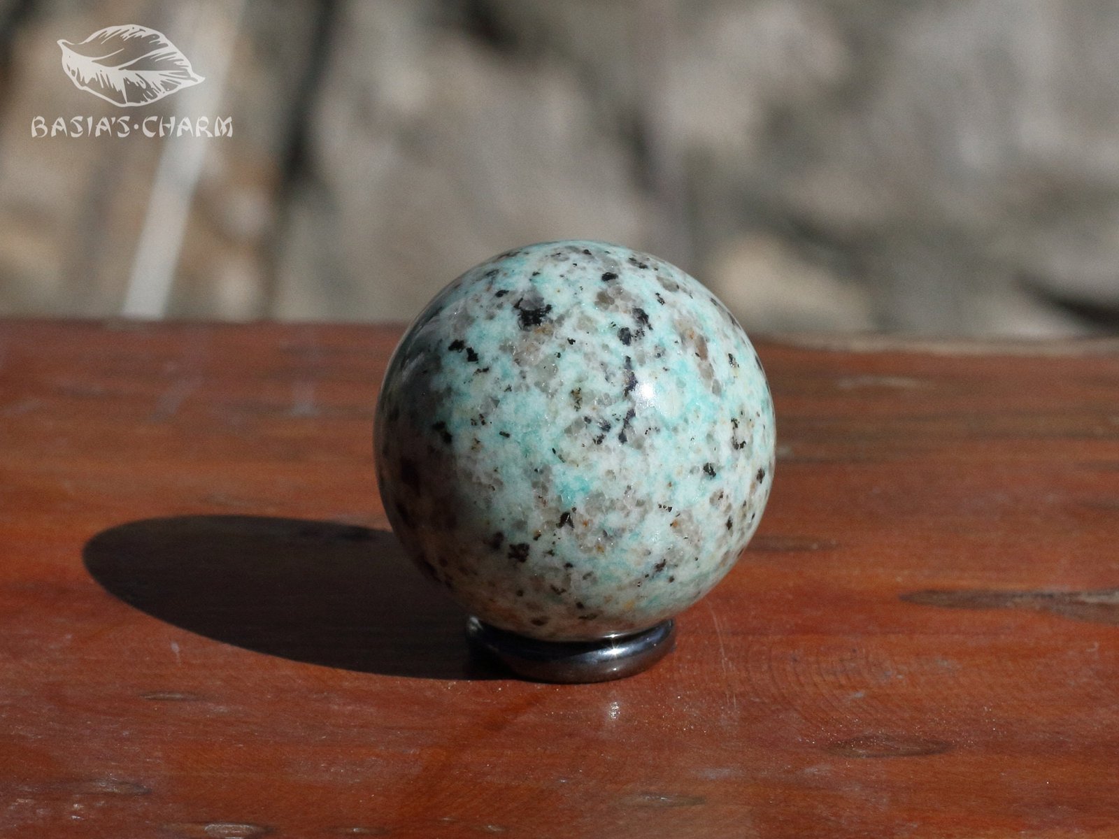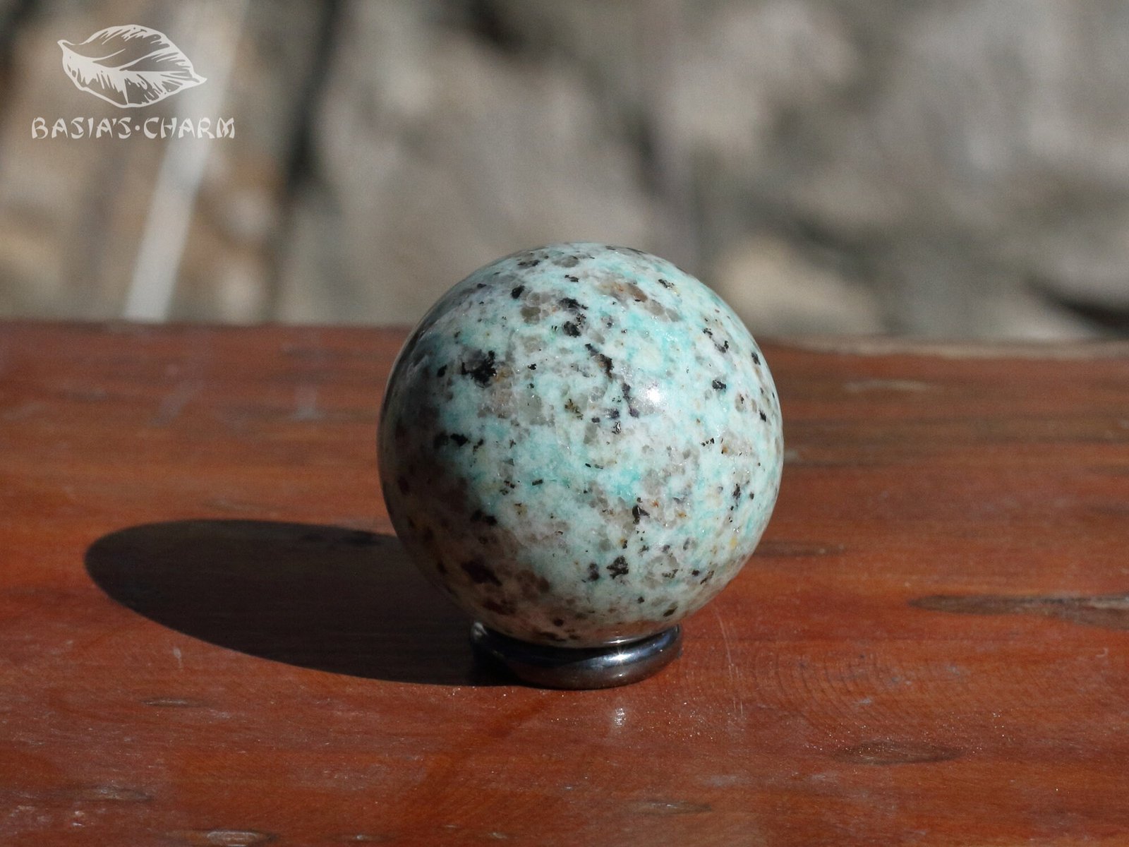 Short description: This sphere is made of granite rock, which consists of blue amazonite, smoky quartz and mica.