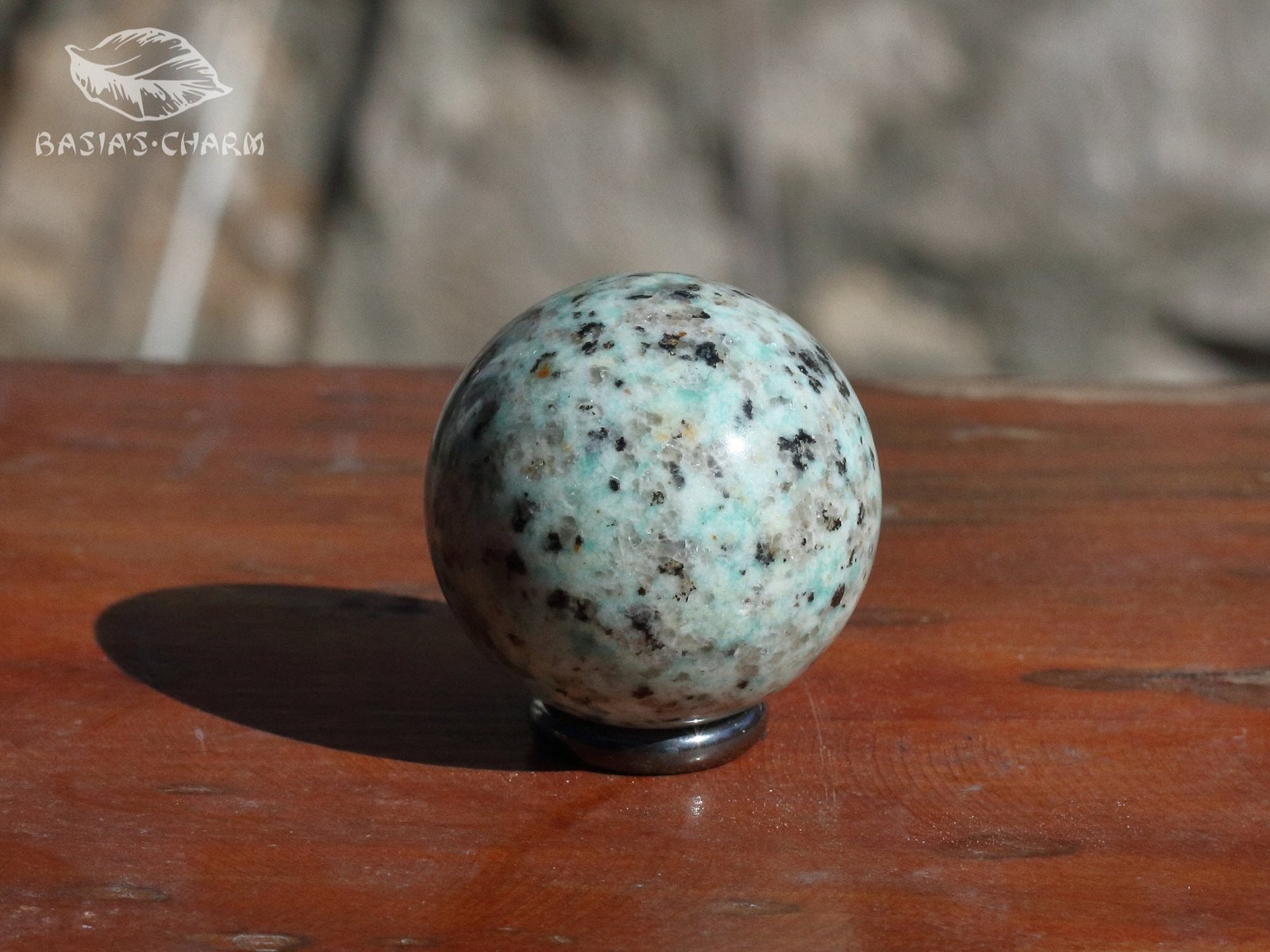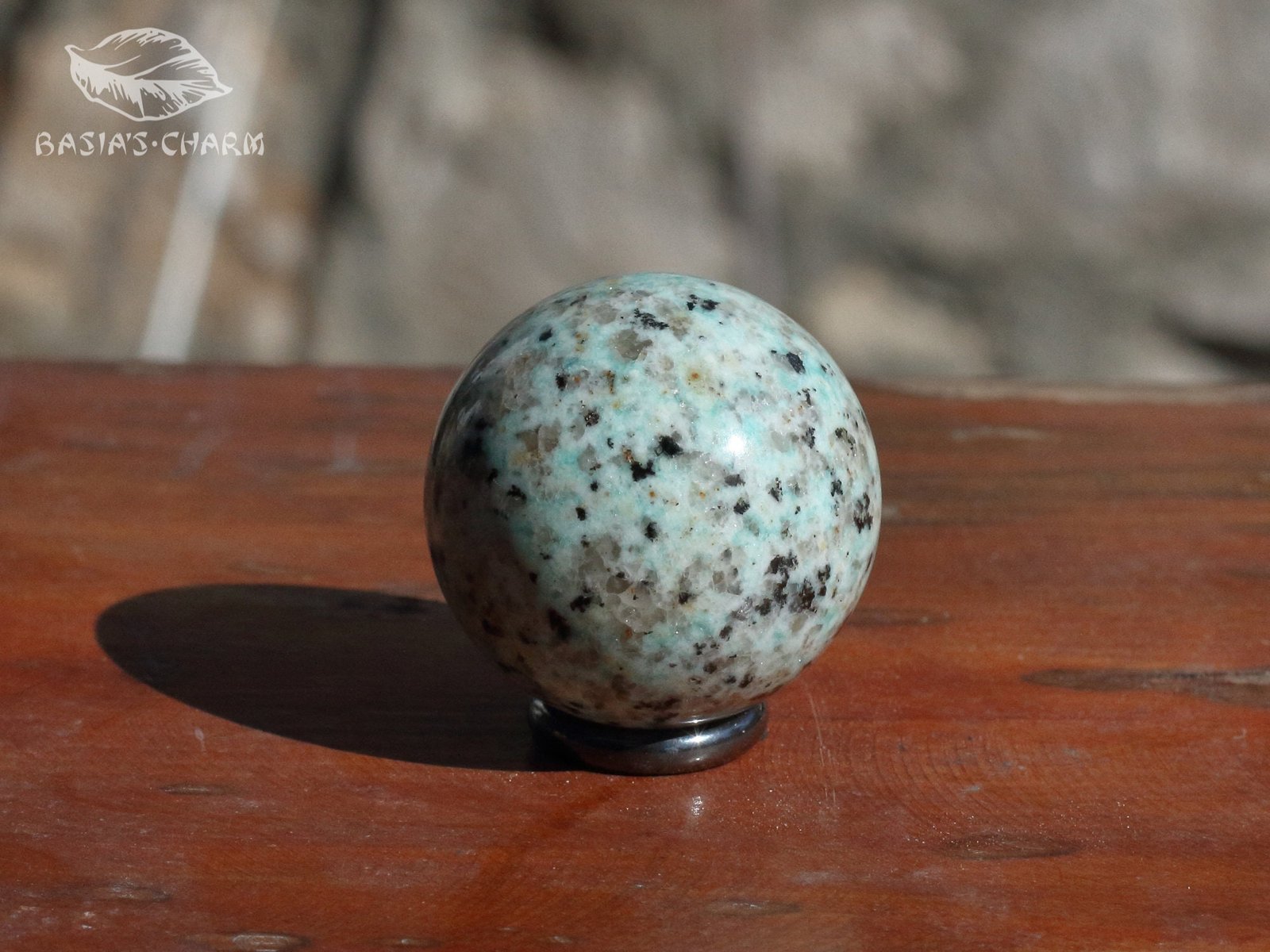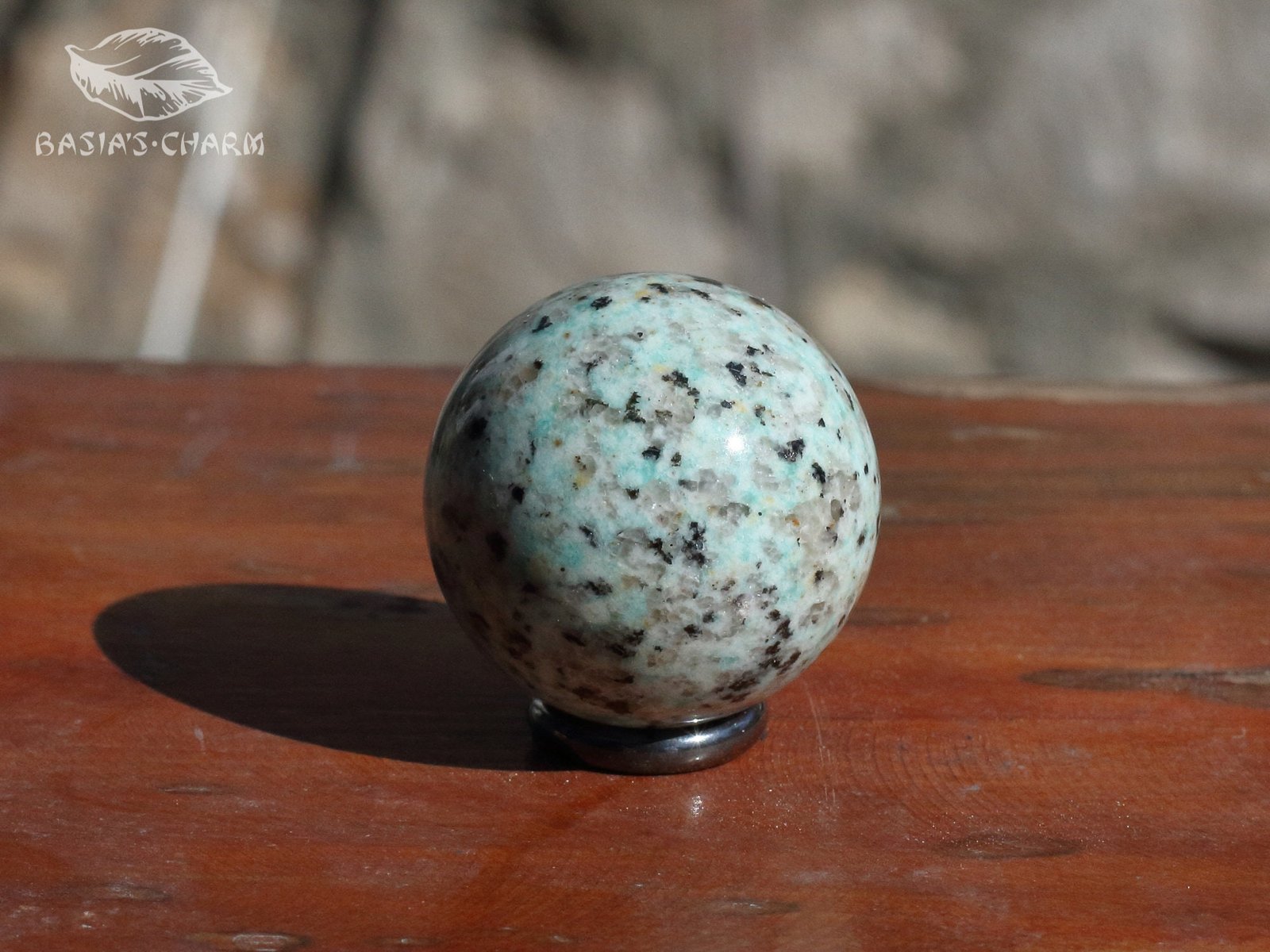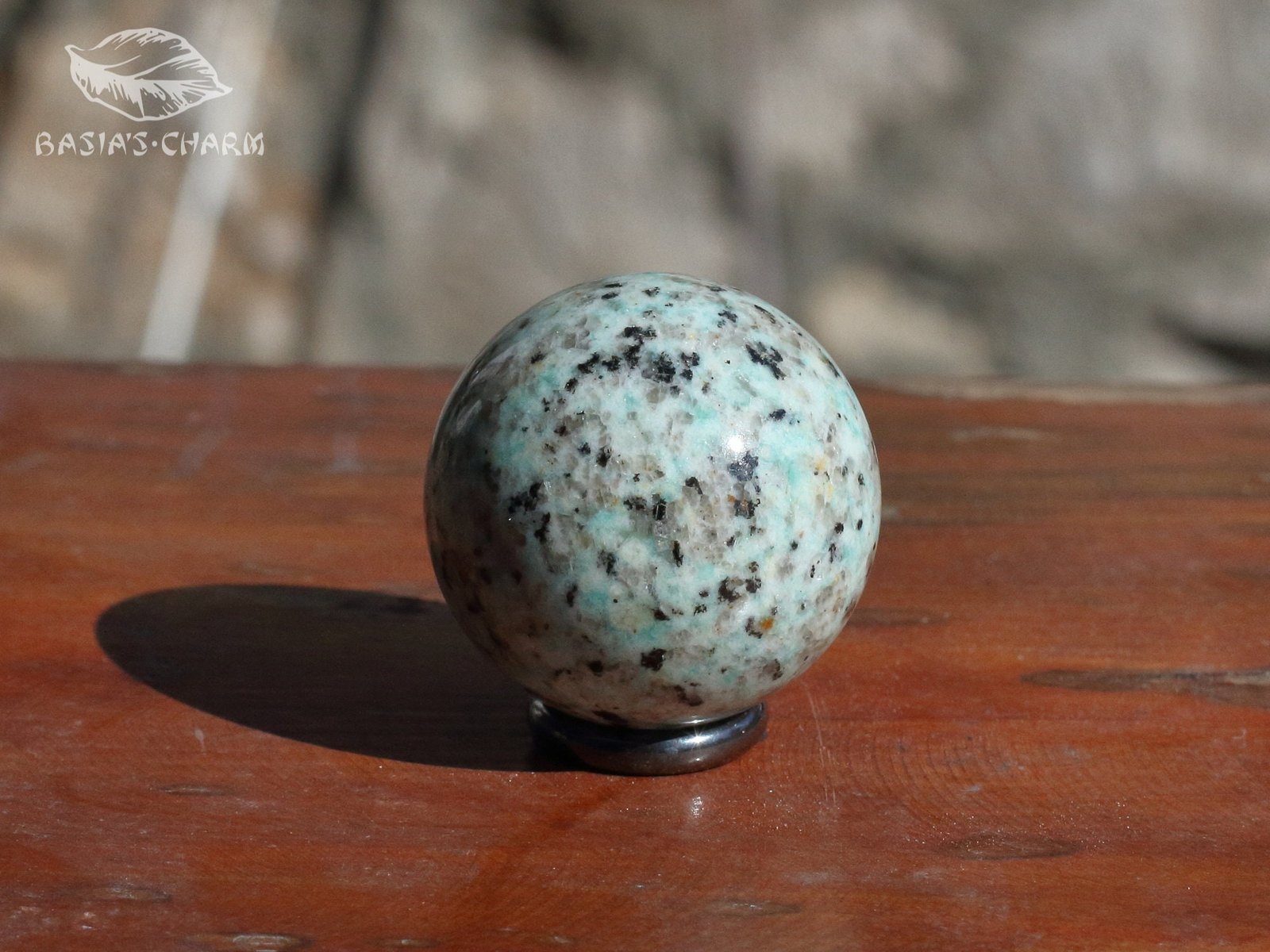 Short description: This sphere is made of granite rock, which consists of blue amazonite, smoky quartz and mica.
