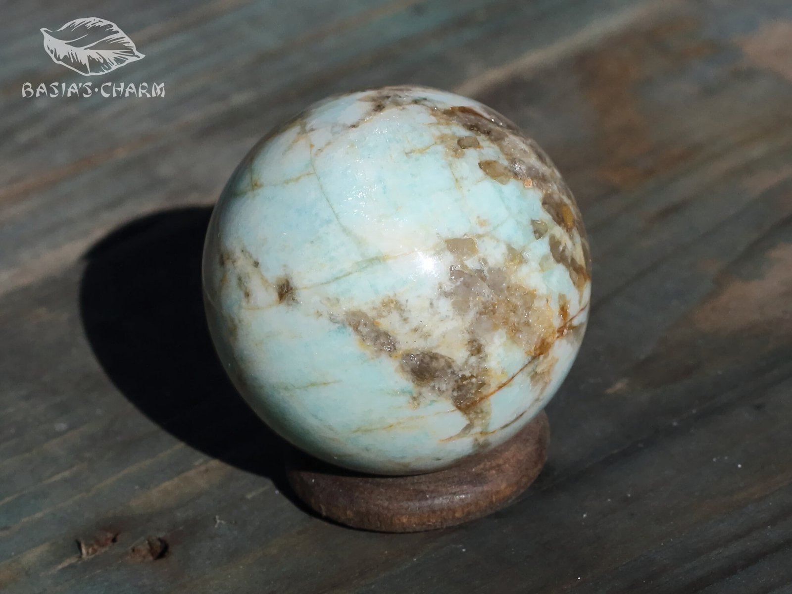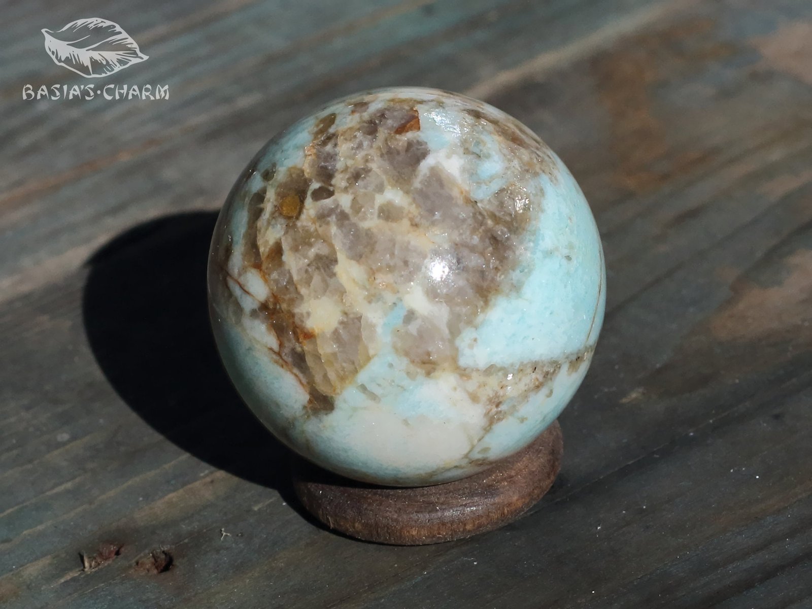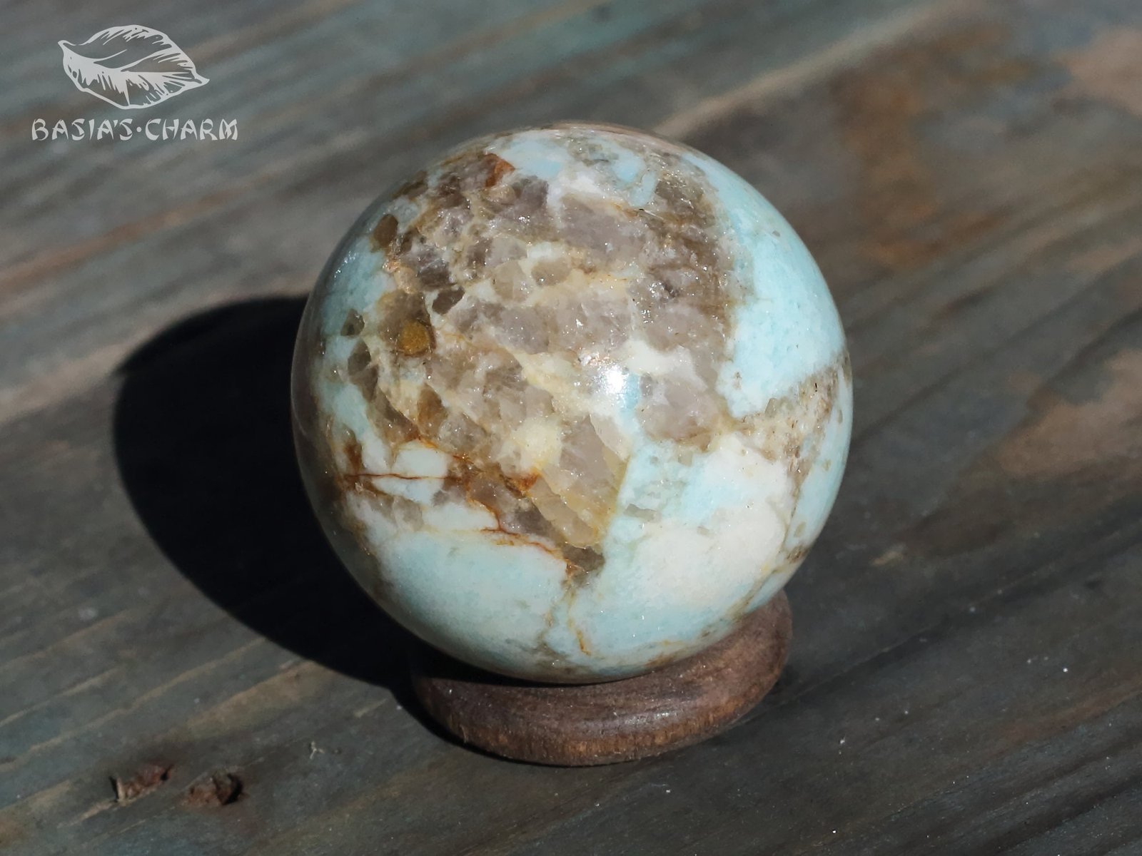 Short description: This sphere is made of the rock, which consists of blue amazonite and smoky quartz.