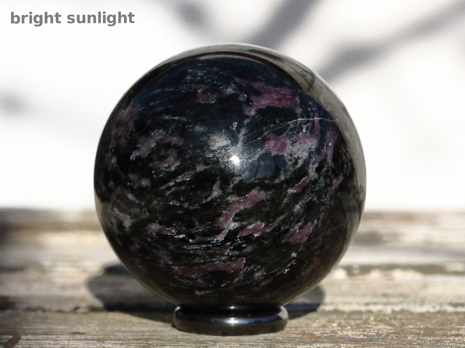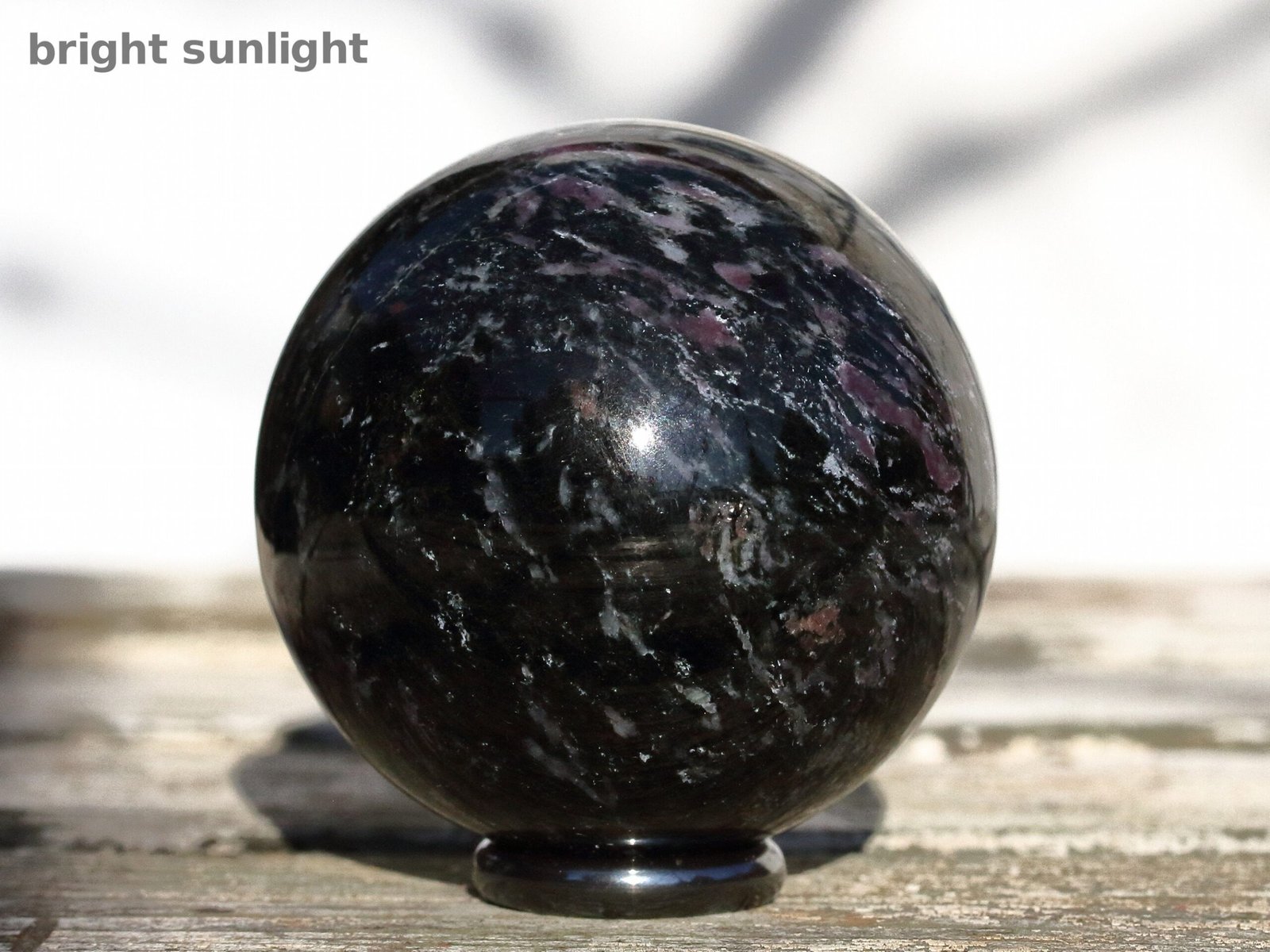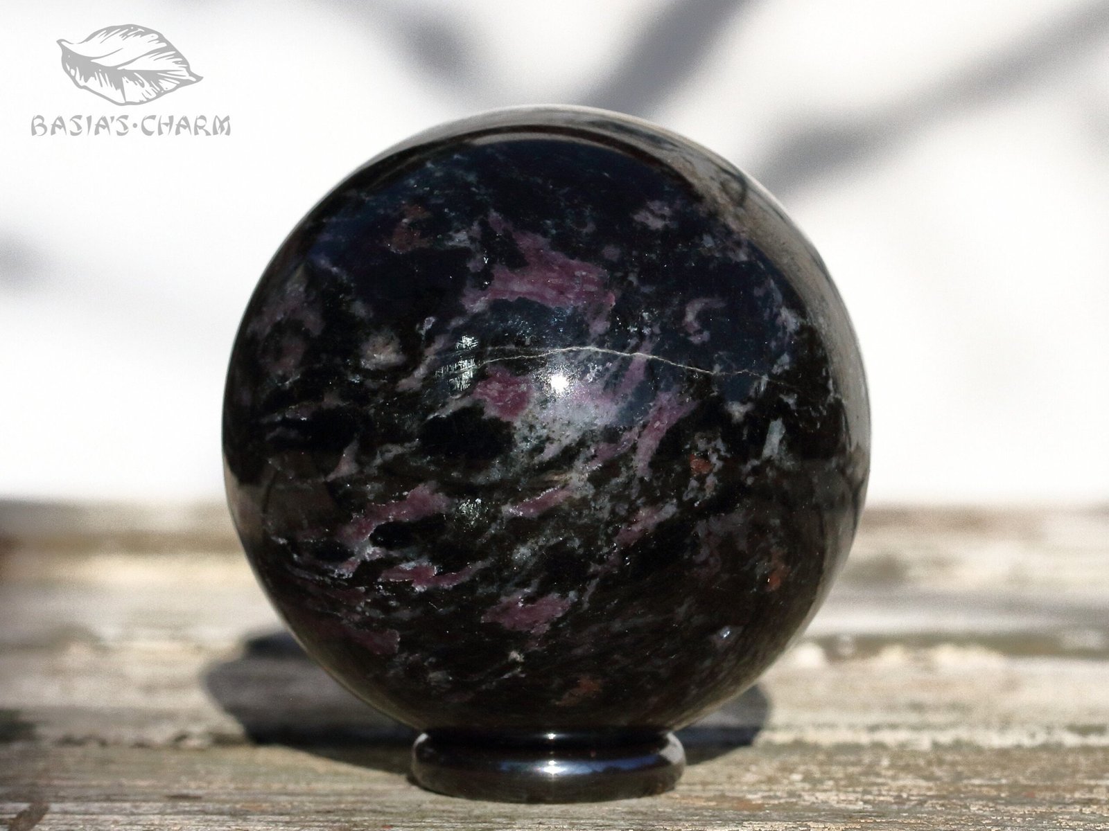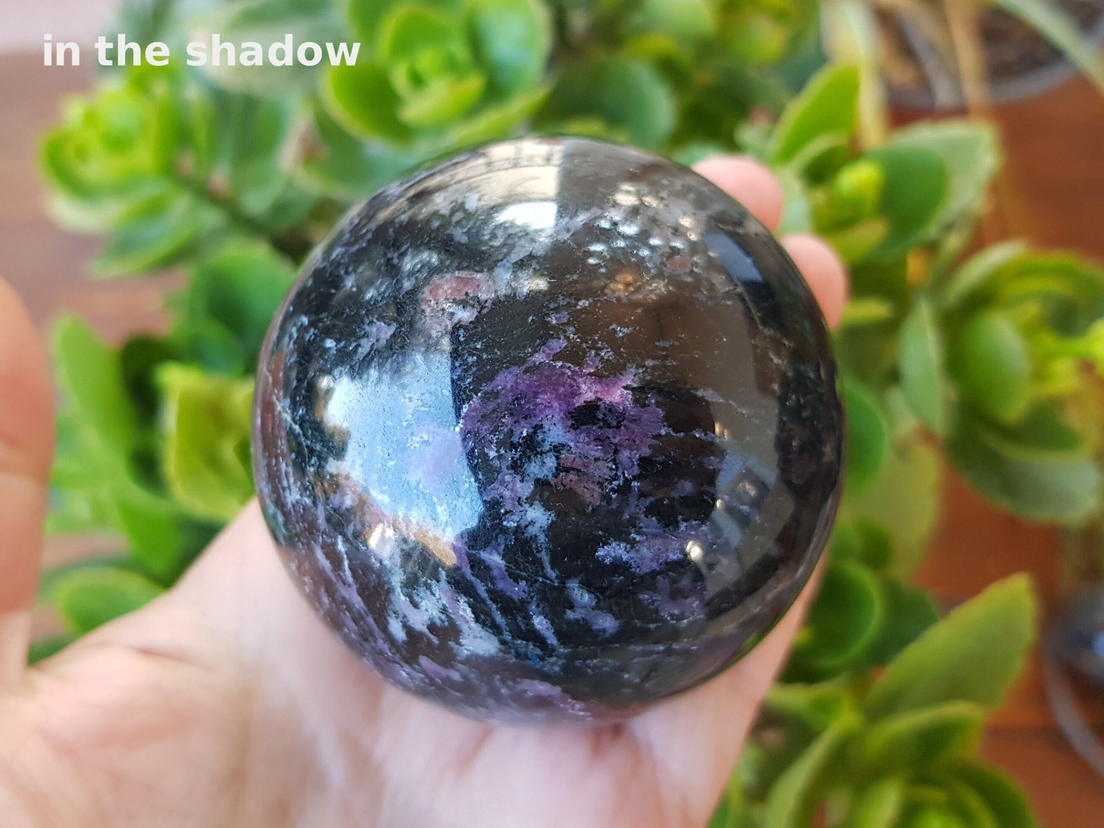 Short description: This sphere made of amphibolite with kataranskite (violet) and almandine garnet (red-brown).