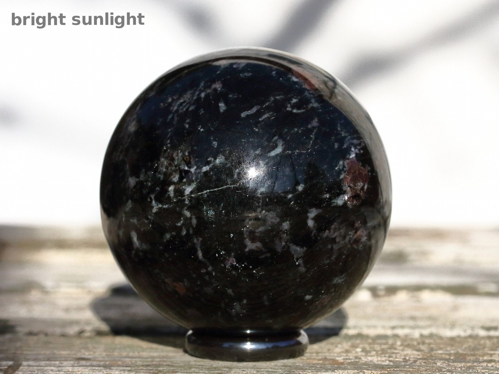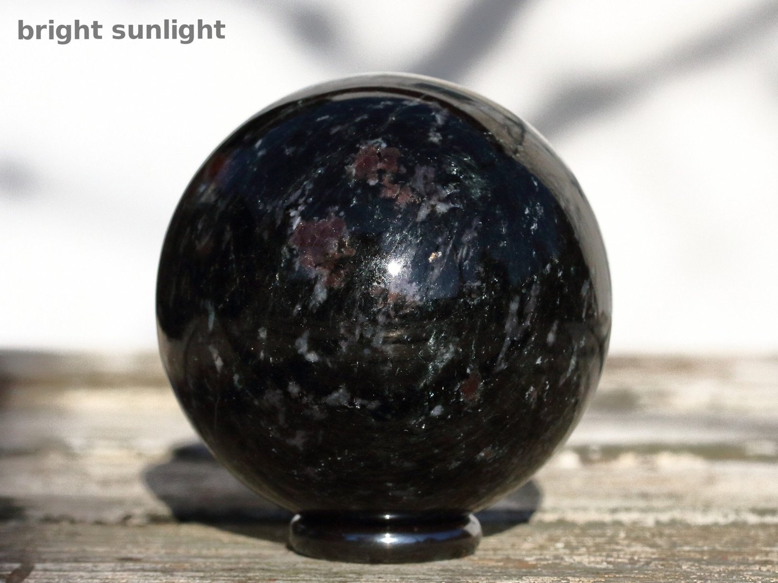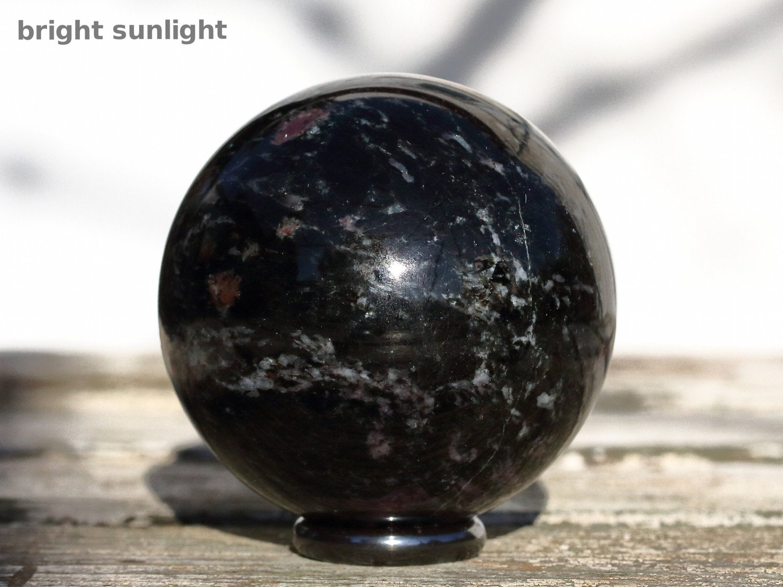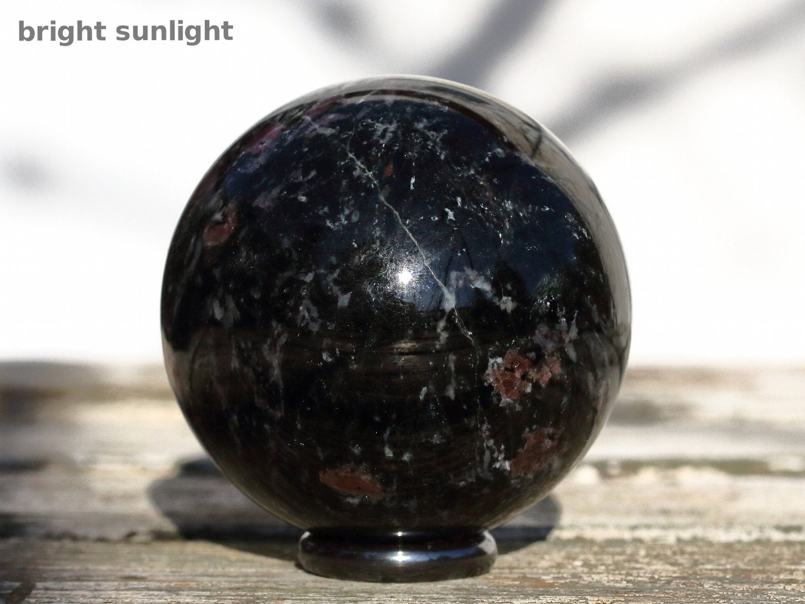 Short description: This sphere made of amphibolite with kataranskite (violet) and almandine garnet (red-brown).