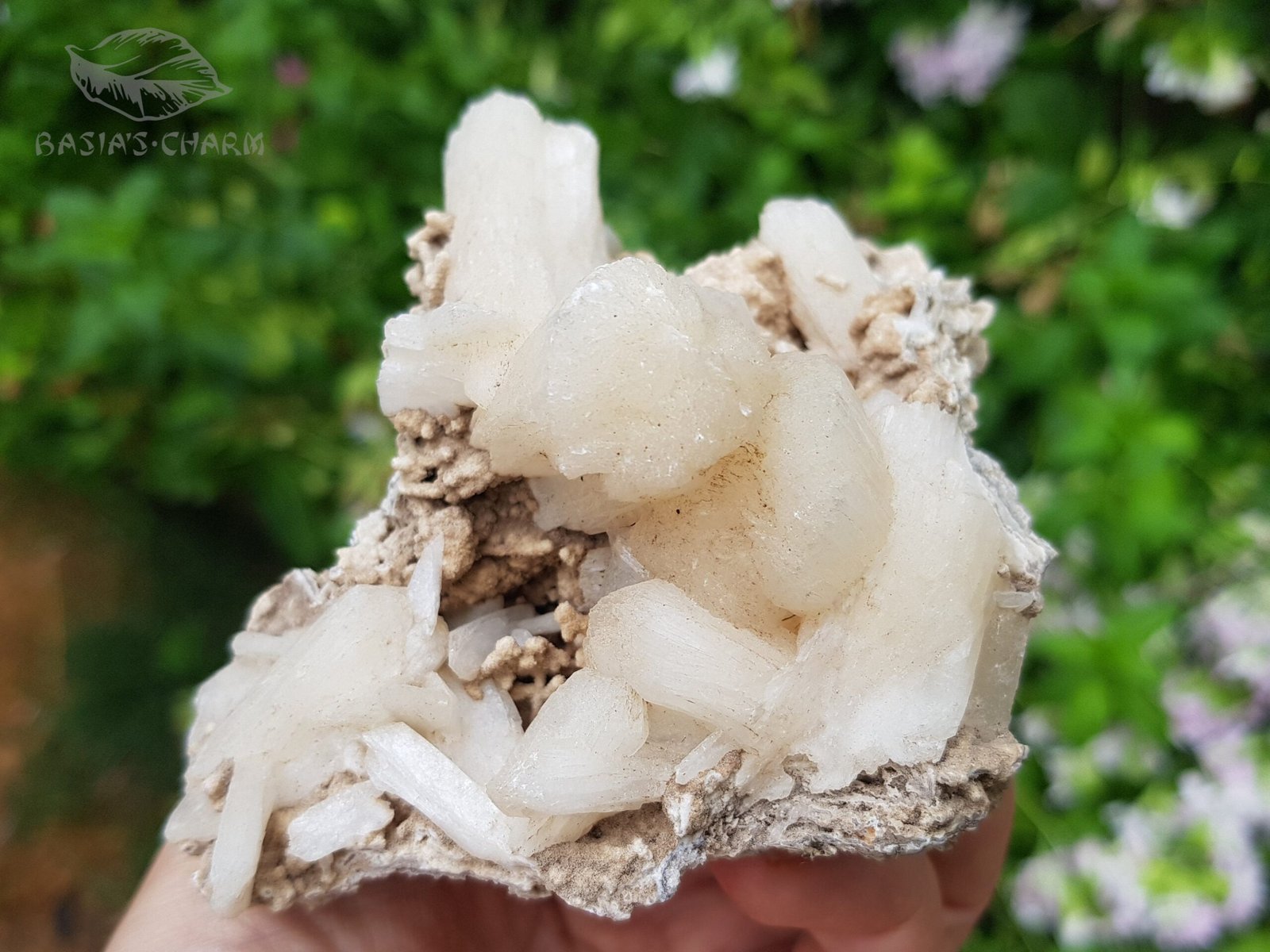 Short description: Druse of colorless stilbite-Ca crystals on thread chalcedony.
